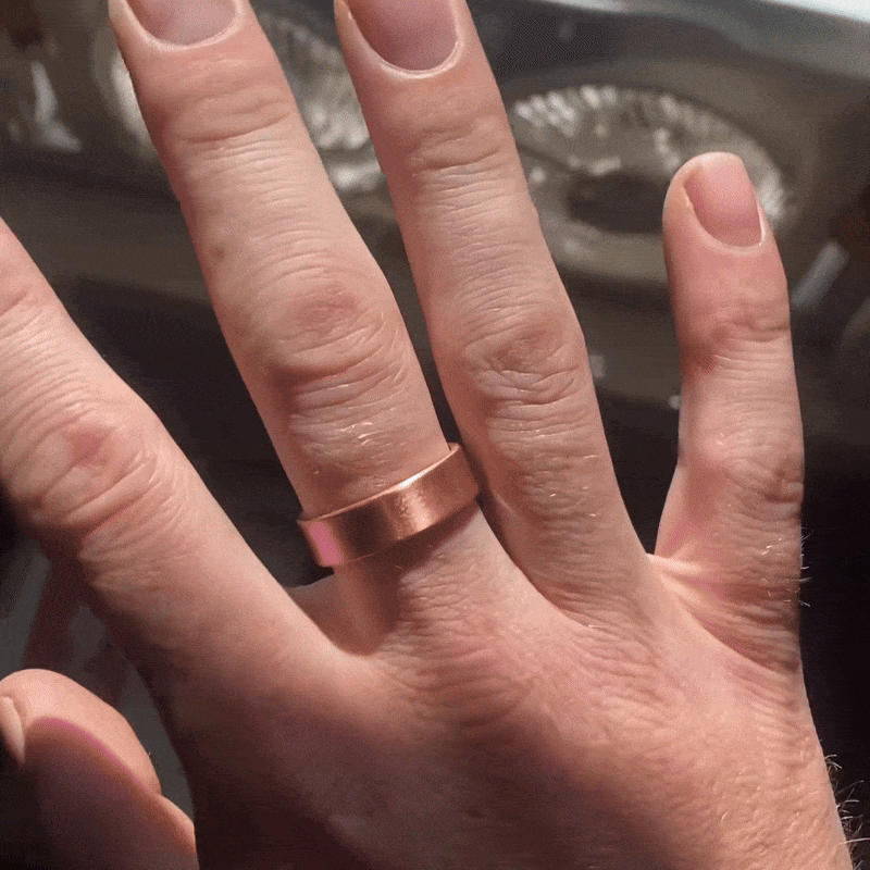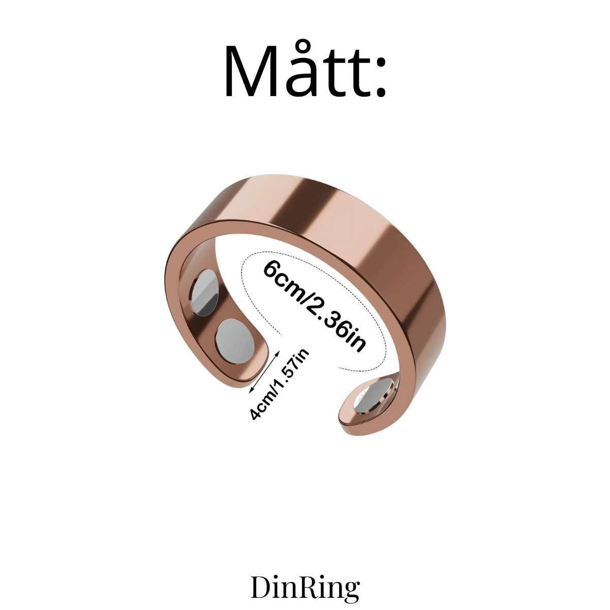 DinRing kombinerar högkvalitativ koppar med inbyggda magneter på insidan, utformade för att ha direkt kontakt med fingret under användning. Det gör den till mer än en vanlig ring – den är framtagen som ett diskret stöd i vardagen.